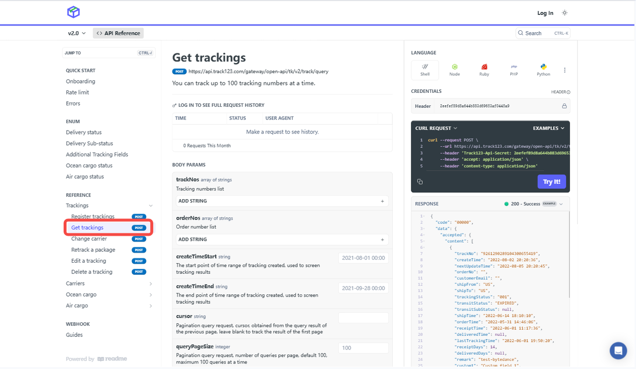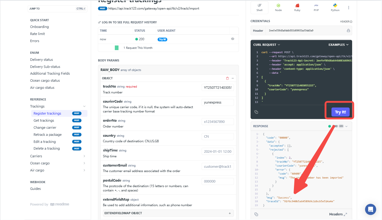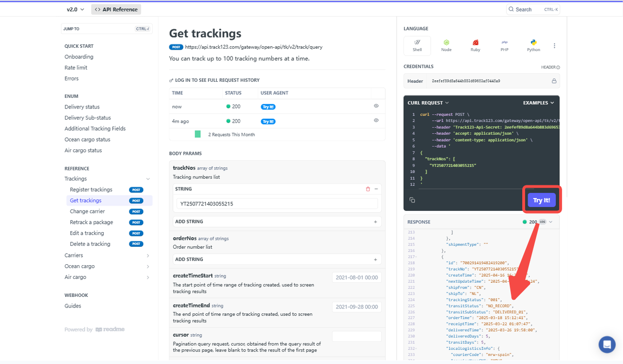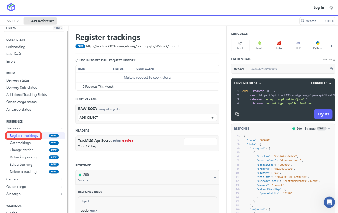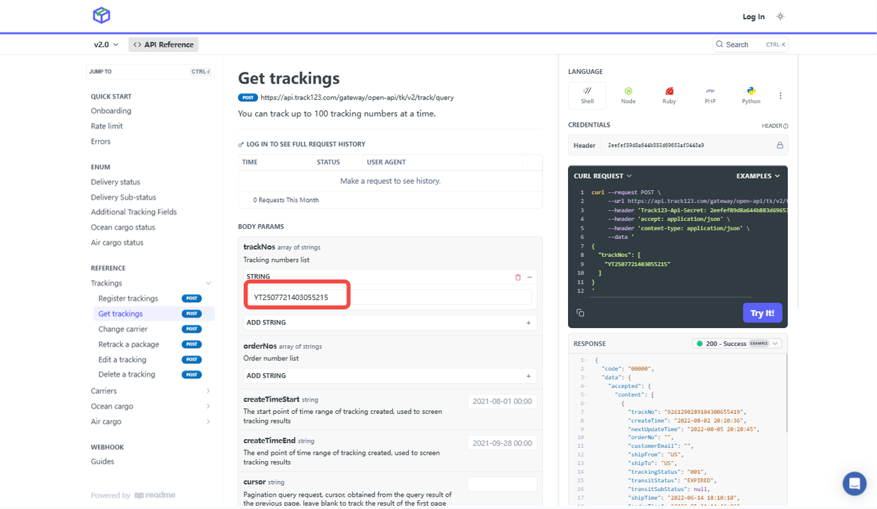 In this section,we'll mainly look at the most important functions of Track123 API: Register a tracking and Get tracking updates.