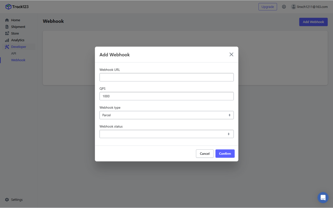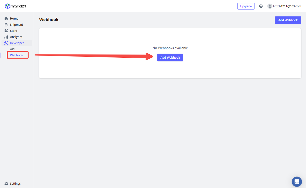 Log into your Track123 account and go to Developer > Webhook.Click 'Add Webhook'
