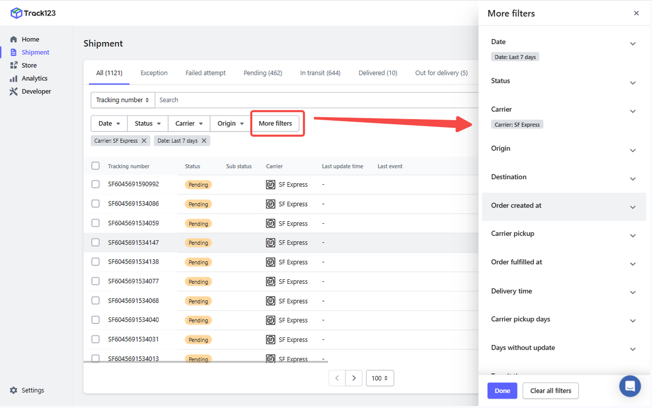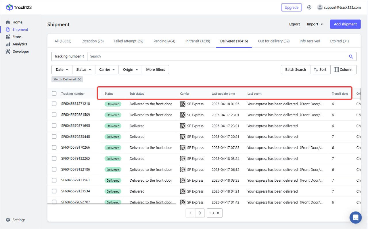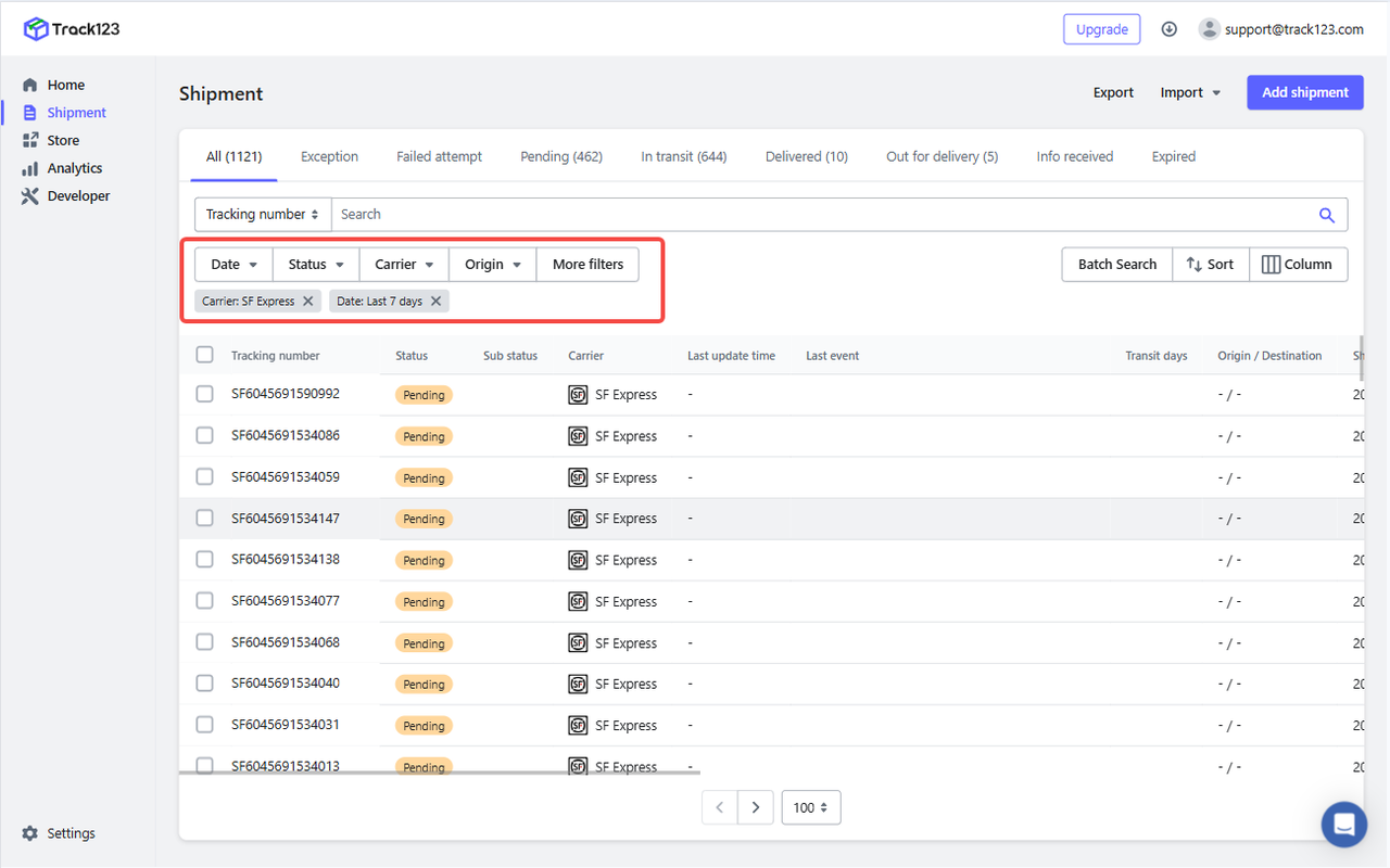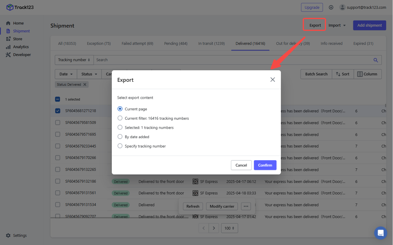 - Export Shipment Data Track123 also allows you to export shipment data into CSV or Excel formats. This can be helpful for keeping records, generating reports, or analyzing shipment performance over time.