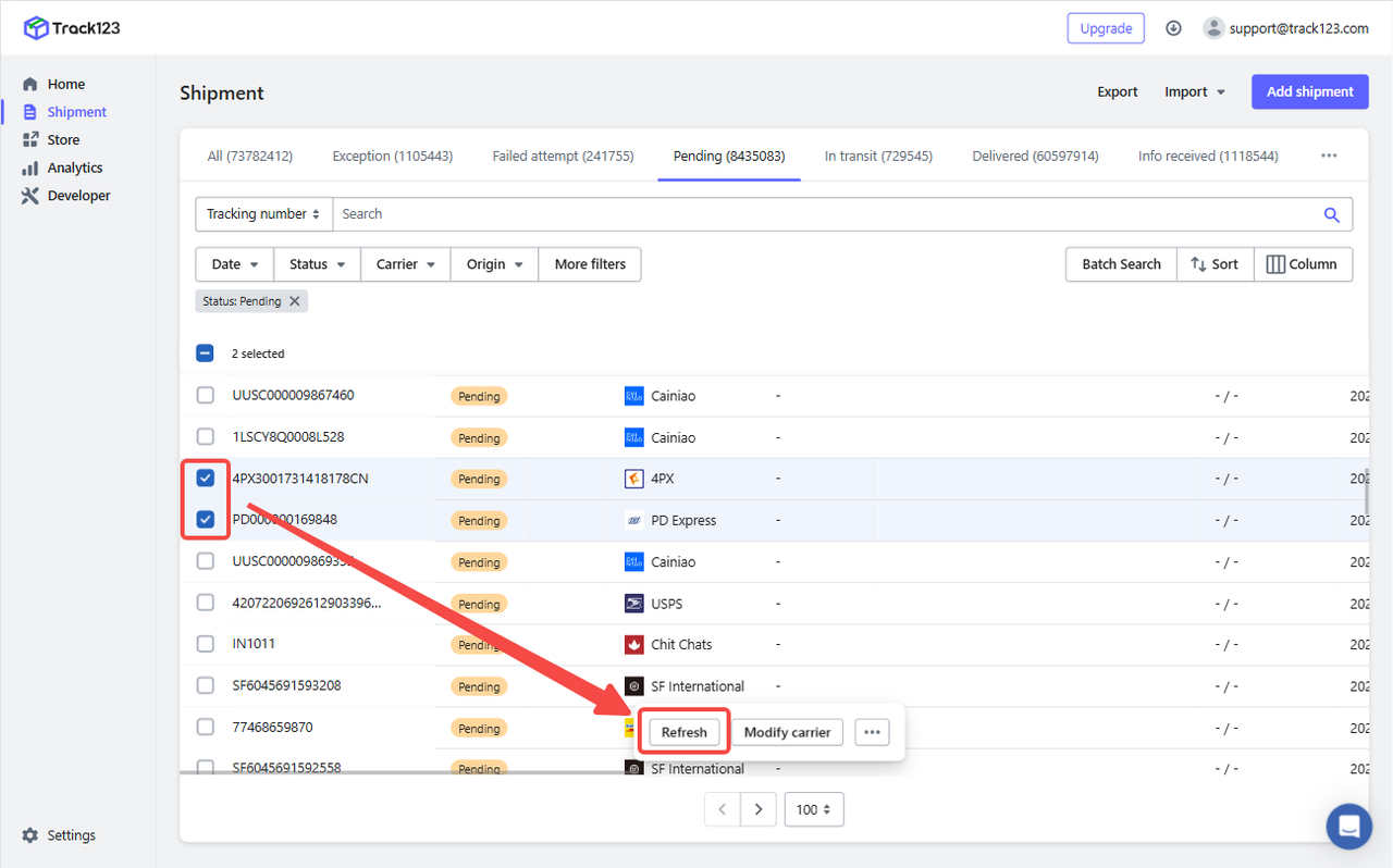 If you wanna get the latetest tracking information, you can refresh manually to get the latest status from the carrier official website.Choose the orders you need to track and click 'refresh'.